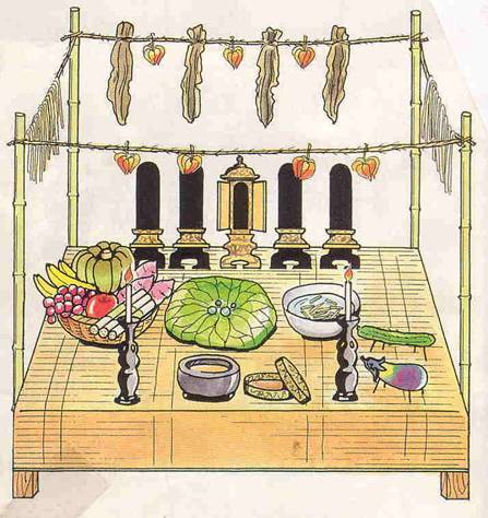 日本人一般都在8月12日太阳落下后到13日太阳升起之前,布置好魂龛,并准备好祭品。