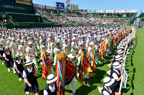 第94回全国高校野球選手権大会(朝日新聞社·日本高校野球連盟主催、毎日新聞社後援、阪神甲子園球場特別協力)が8日、兵庫県西宮市の阪神甲子園球場で開幕した。午前9時に始まった開会式では、前年優勝の日大三(西東京)を先頭に、全国49チームの代表校が力強く行進。15日間の熱戦を繰り広げる。開幕試合は常葉橘(静岡)と福井工大福井(福井)の顔合わせ。朝日新聞デジタル2012年8月8日9時12分