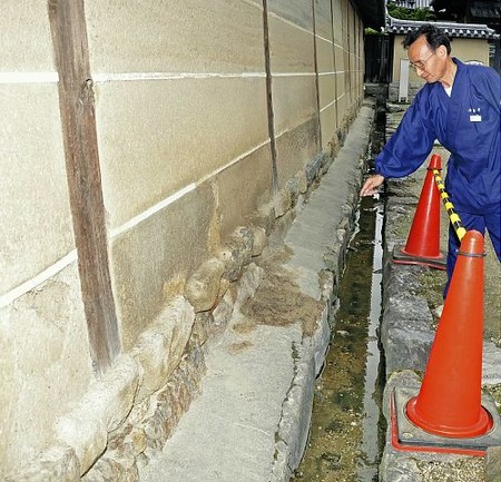 奈良県斑鳩町の世界遺産?法隆寺で20日午前10時頃、寺の職員が重要文化財の築地塀(ついじべい)「東院大垣」(江戸時代)が高さ34セン•、幅?4メートル、厚さ5ミリにわたってはがれ落ちているのを見つけた。読売新聞 6月20日(水)14時32分配信
