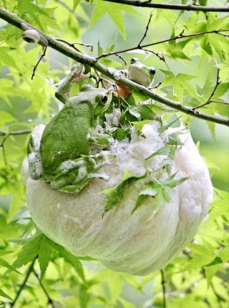 京都市左京区の赤山(せきざん)禅院の庭で、モリアオガエルの産卵がピークを迎えている。カエデの枝の新緑に白い卵塊が映える光景は、7月中旬頃まで見られるという。日本固有種のモリアオガエルは天敵を避けるため、樹上で体の粘液で作った泡の中に産卵。オタマジャクシは卵塊の中で孵化(ふか)し、池に落ちて成長する。読売新聞 6月21日(木)14時25分配信