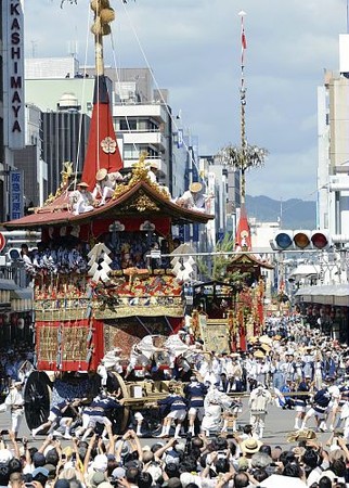 京都·祇園祭の山鉾(やまほこ)巡行が17日、京都市内であり、約13万人(午前11時現在、京都府警調べ)が豪華な懸装品(けそうひん)で飾られた山鉾32基を堪能した。