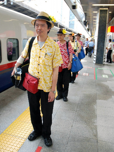 译文:JR东京站的东北上越新干线的站台上,清洁员穿着夏威夷风格的衬衣和草帽工作。20日开始还要用木槿花装饰帽子。平常他们都是穿着竖条纹的衬衣和棒球帽,从今年6月开始改为夏威夷风。
