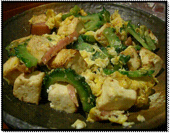传统的日式料理清淡,而冲绳当地的美食则更接近于中国菜的风格。最具代表性的是一道苦瓜炒什锦。这道菜的主要原料就是苦瓜,里面还有豆腐,其他蔬菜和猪肉,在出锅前还要加进鸡蛋。豆腐选用的也是冲绳特有的“岛豆腐”,类似于中国的老豆腐,蛋白质含量很高。由于苦瓜含有高维生素C且有助于降低血压及血糖值,所以它也被认为是冲绳人长寿的一个原因。