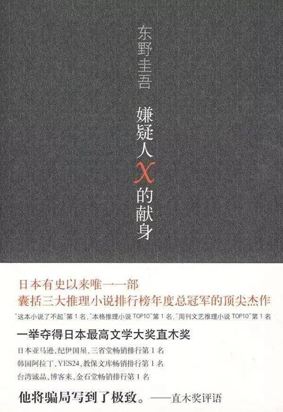 《嫌疑人x的献身》作为日本著名悬疑推理大师东野圭吾的代表作之一,曾同时获得直木奖和本格推理小说大奖。并创造了日本推理小说史上绝无仅有的奇迹——同时摘得“这本小说了不起”、“本格推理小说Top 10”、“周刊文艺推理小说Top 10”三大推理小说排行榜年度总冠军。